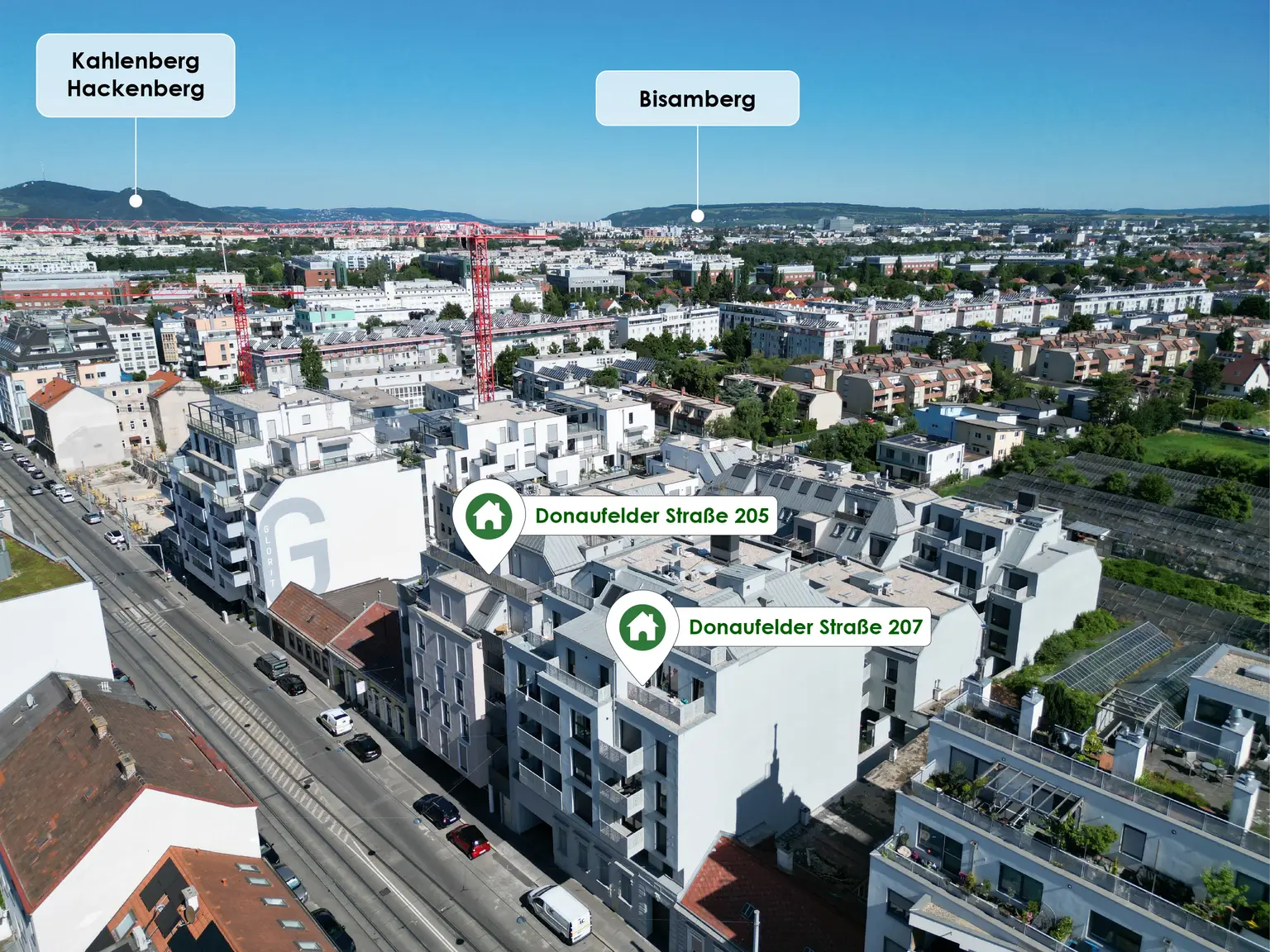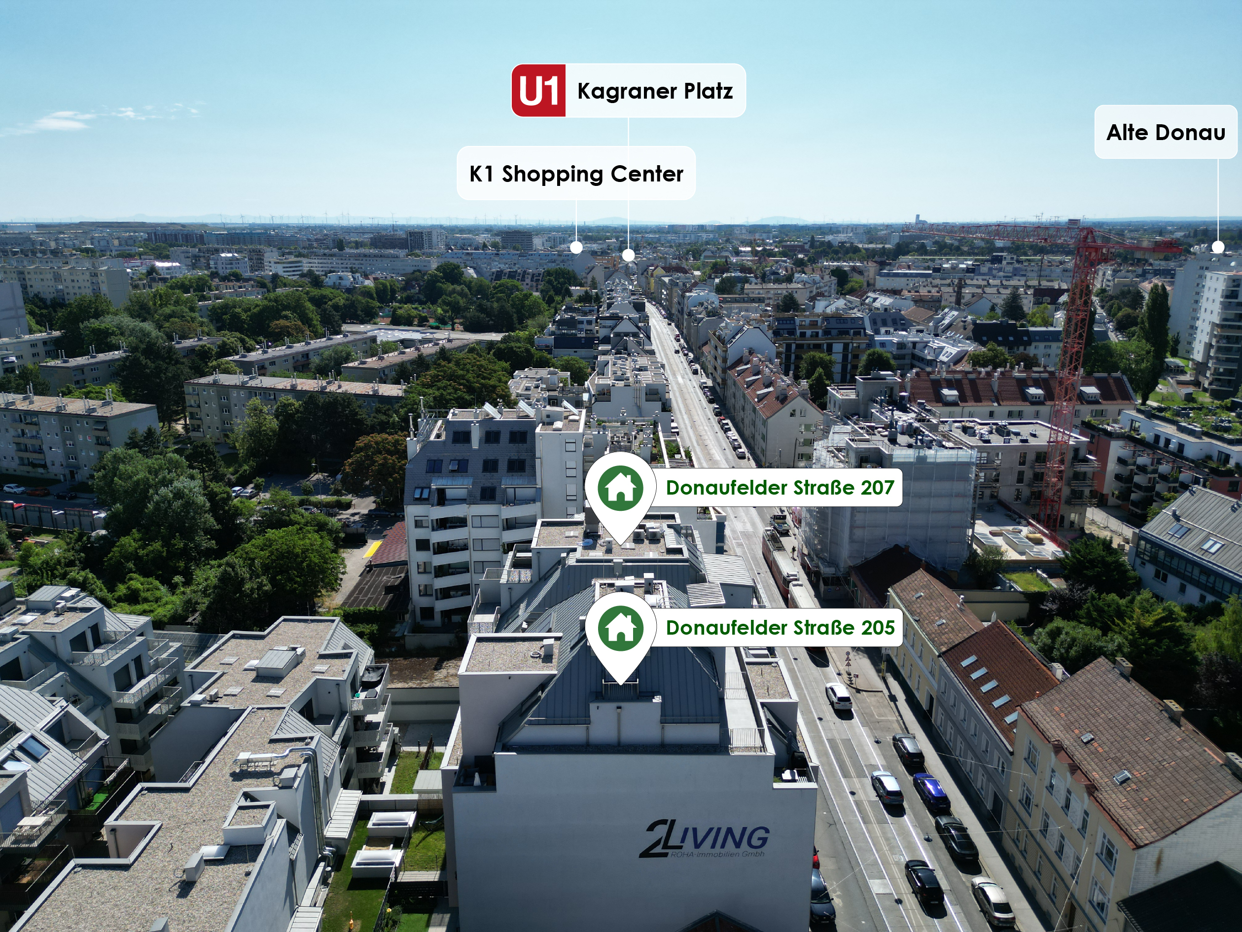 Die ideale Lage des Erstbezugs-Neubau bietet eine hervorragende Anbindung an die Straßenbahnen 25, 26, sowie die Busse 22A und 27A und die U1-Station Kagraner Platz, welche Sie mit den Hot-Spots Wiens verbindet. Die Alte Donau ist in wenigen Autominuten erreichbar und bietet Ihnen durch ihre idyllische Atmosphäre, zahlreichen Restaurants, sowie vielfältigen Sportmöglichkeiten einen perfekten Ort für Ihre Freizeitgestaltung.