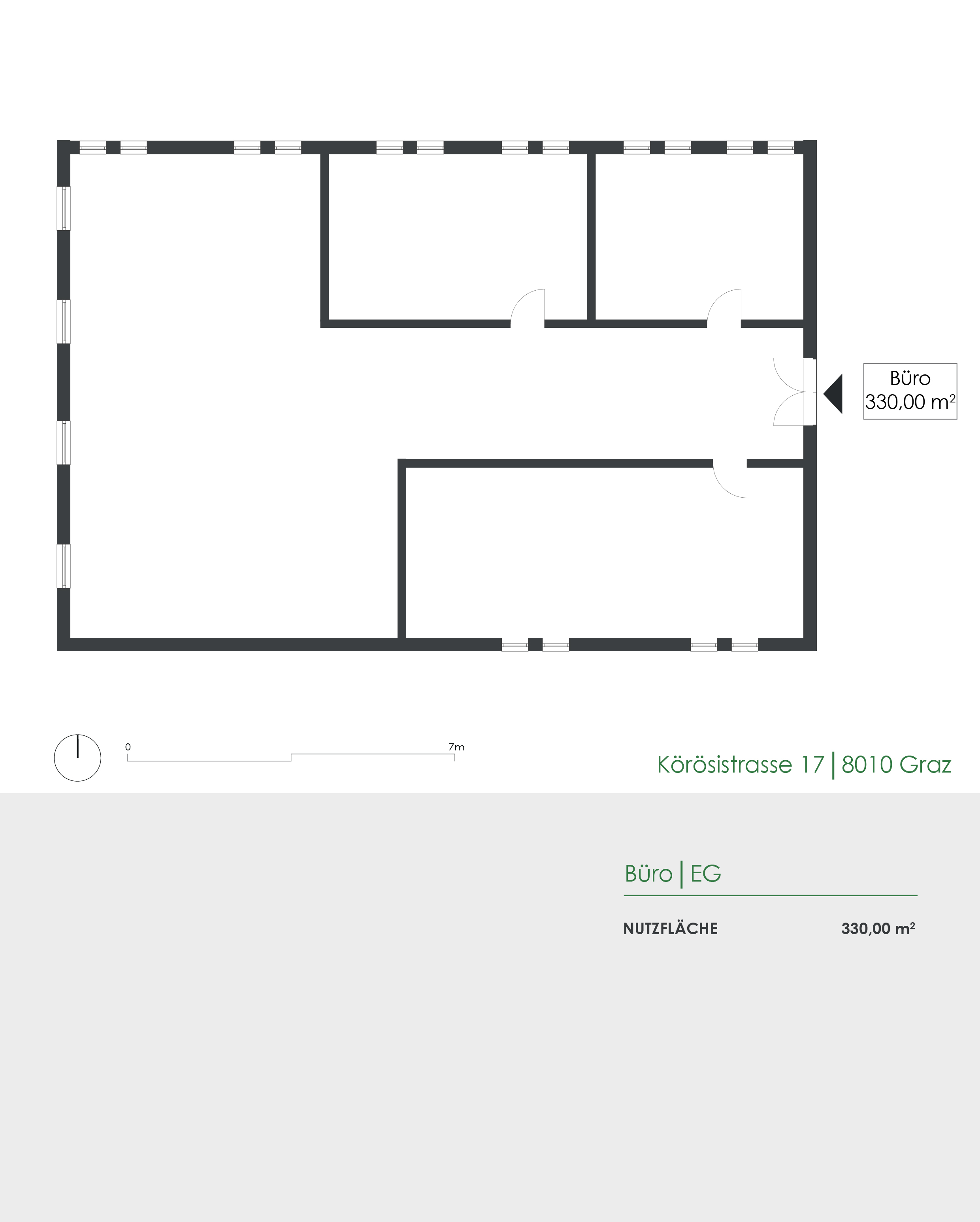 Die Fläche besticht durch sehr helle, lichtdurchflutete Räume, die eine angenehme Arbeitsatmosphäre schaffen. Dank der durchdachten Struktur lässt sich die Immobilie flexibel an individuelle Anforderungen anpassen.